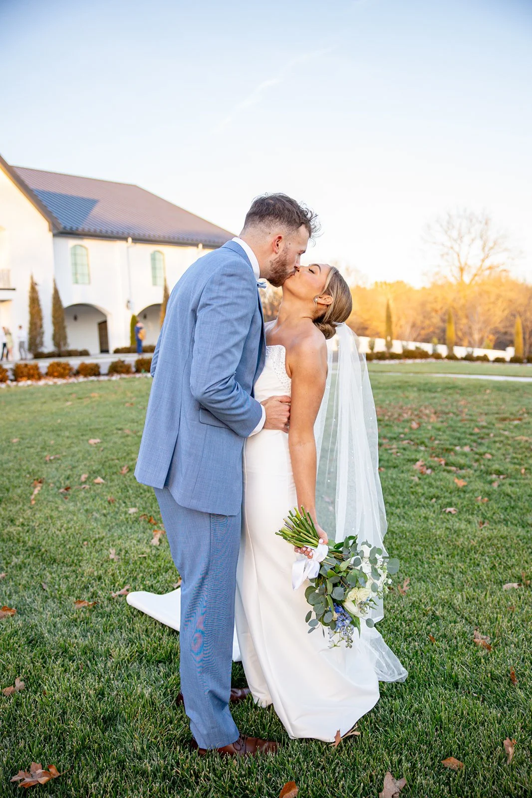 A bride and groom kissing on a lawn during sunset, with a white building and trees in the background.