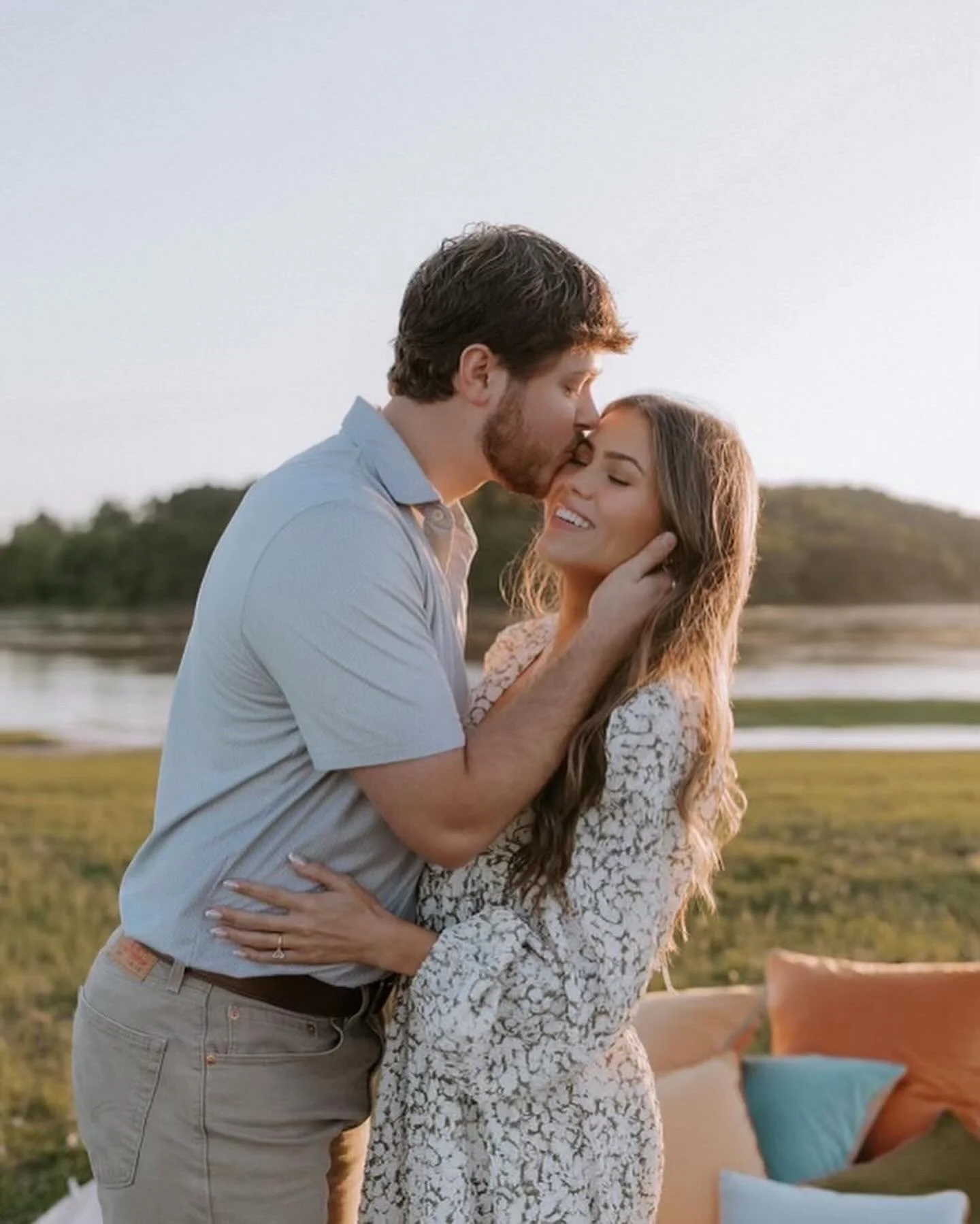 A loving couple sharing a kiss outdoors near a body of water during sunset, with trees in the background and colorful pillows on the ground.